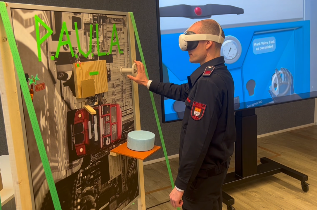 Ziel des Projekts war es die bereits vorhandene Kombination aus Mixed-Reality-Anwendung und realem Prototypen soweit fertig zu stellen, dass diese im Rahmen einer Nutzerstudie im Hinblick auf Aspekte der User Experience evaluiert werden konnte. Perspektivisch sollt dieser Prototyp von der Kölner Feuerwehr für Trainingssimulationen an einer Löschpumpe genutzt werden können. Der Projekttitel den sich die Studierenden schon in Immersive Controls ausgedacht haben und bei dem wir auch in Folgearbeiten geblieben sind ist PAULA (Pump Action User Learning Application).