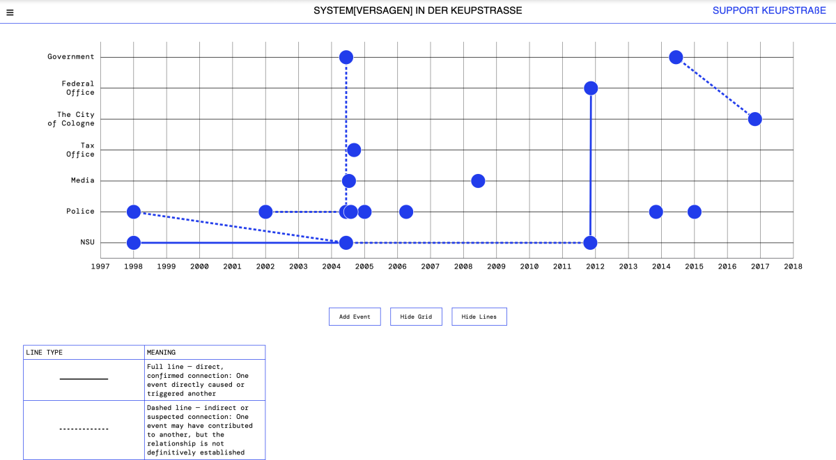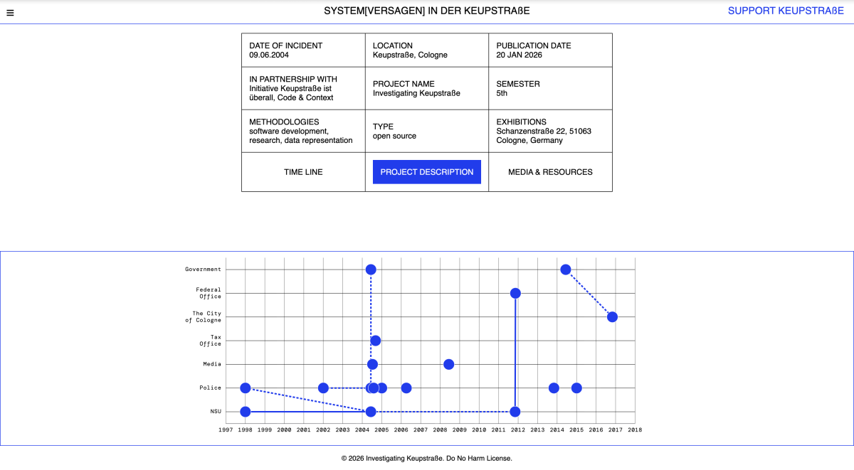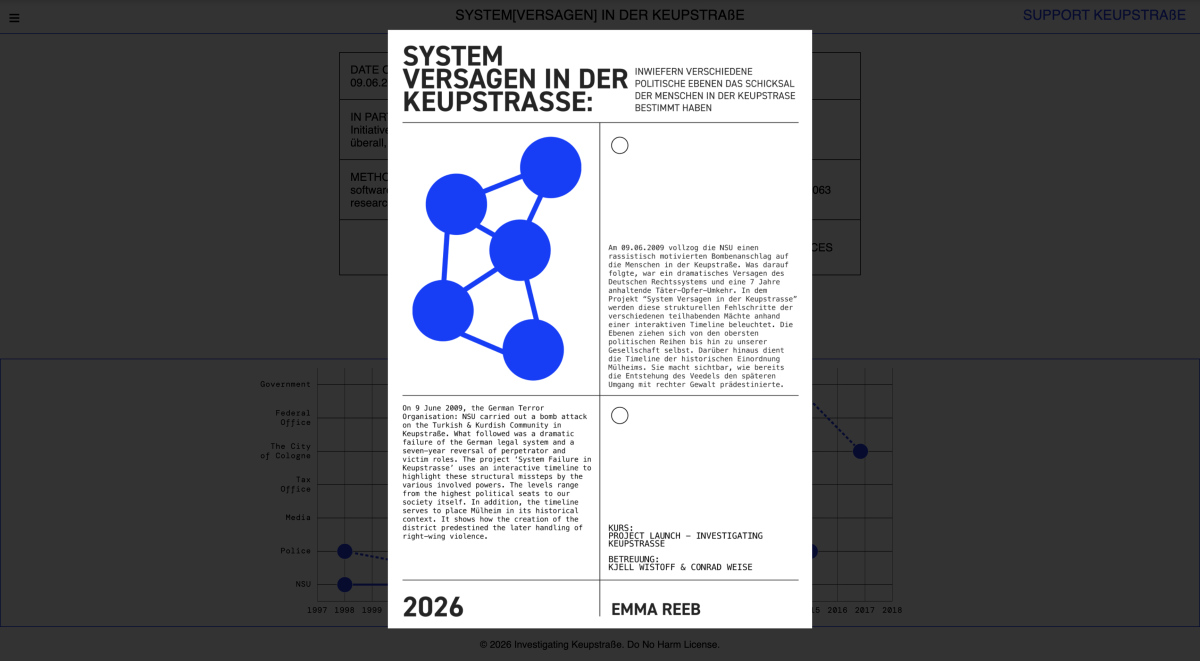 Am 09.06.2009 vollzog die NSU einen rassistisch motivierten Bombenanschlag auf die Menschen in der Keupstraße. Was darauf folgte, war ein dramatisches Versagen des Deutschen Rechtssystems und eine 7 Jahre anhaltende Täter-Opfer-Umkehr. In dem Projekt “System Versagen in der Keupstrasse” von Emma Reeb werden diese strukturellen Fehlschritte der verschiedenen teilhabenden Mächte anhand einer interaktiven Timeline beleuchtet. Die Ebenen ziehen sich von den obersten politischen Reihen bis hin zu unserer Gesellschaft selbst. Darüber hinaus dient die Timeline der historischen Einordnung Mülheims. Sie macht sichtbar, wie bereits die Entstehung des Veedels den späteren Umgang mit rechter Gewalt prädestinierte.