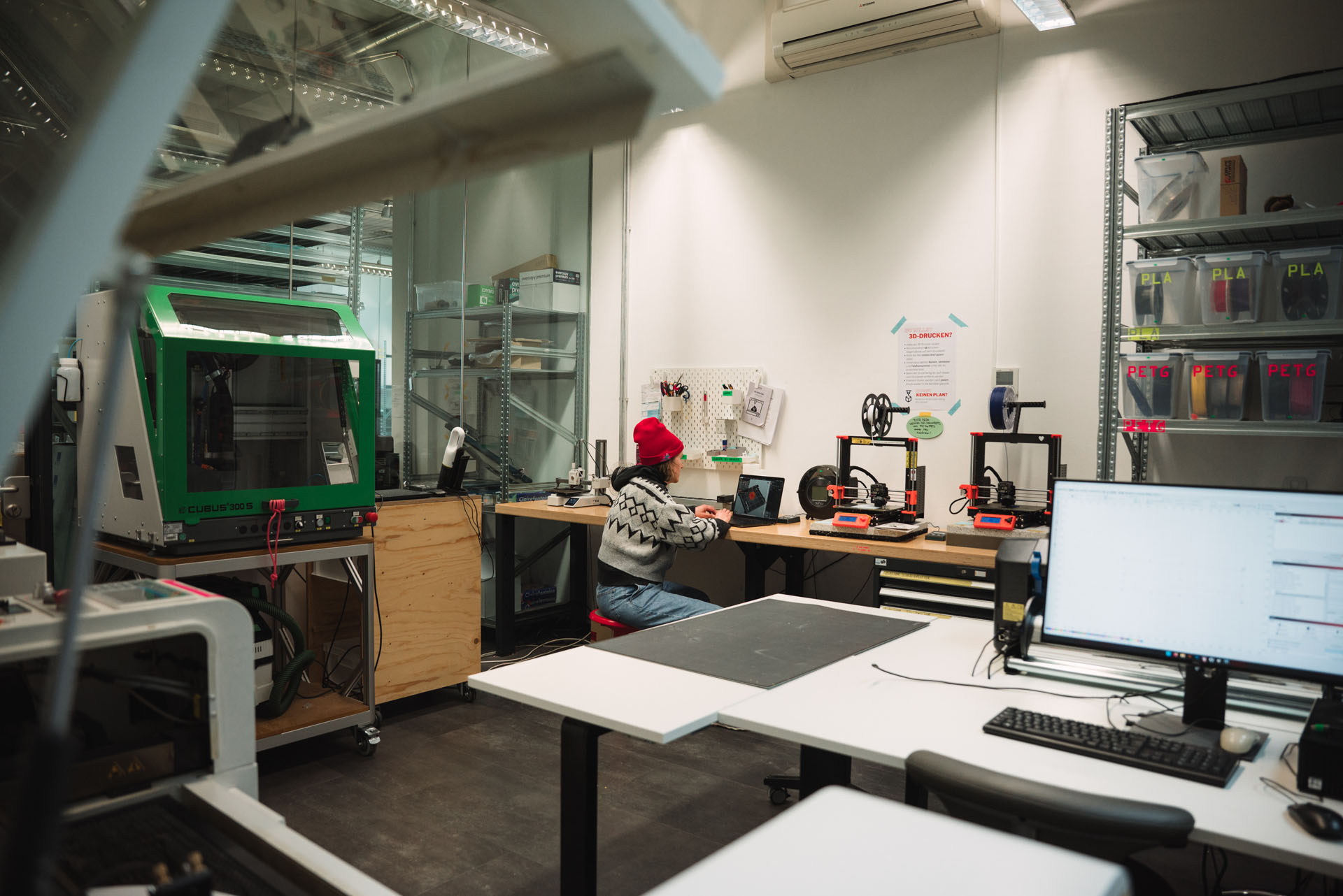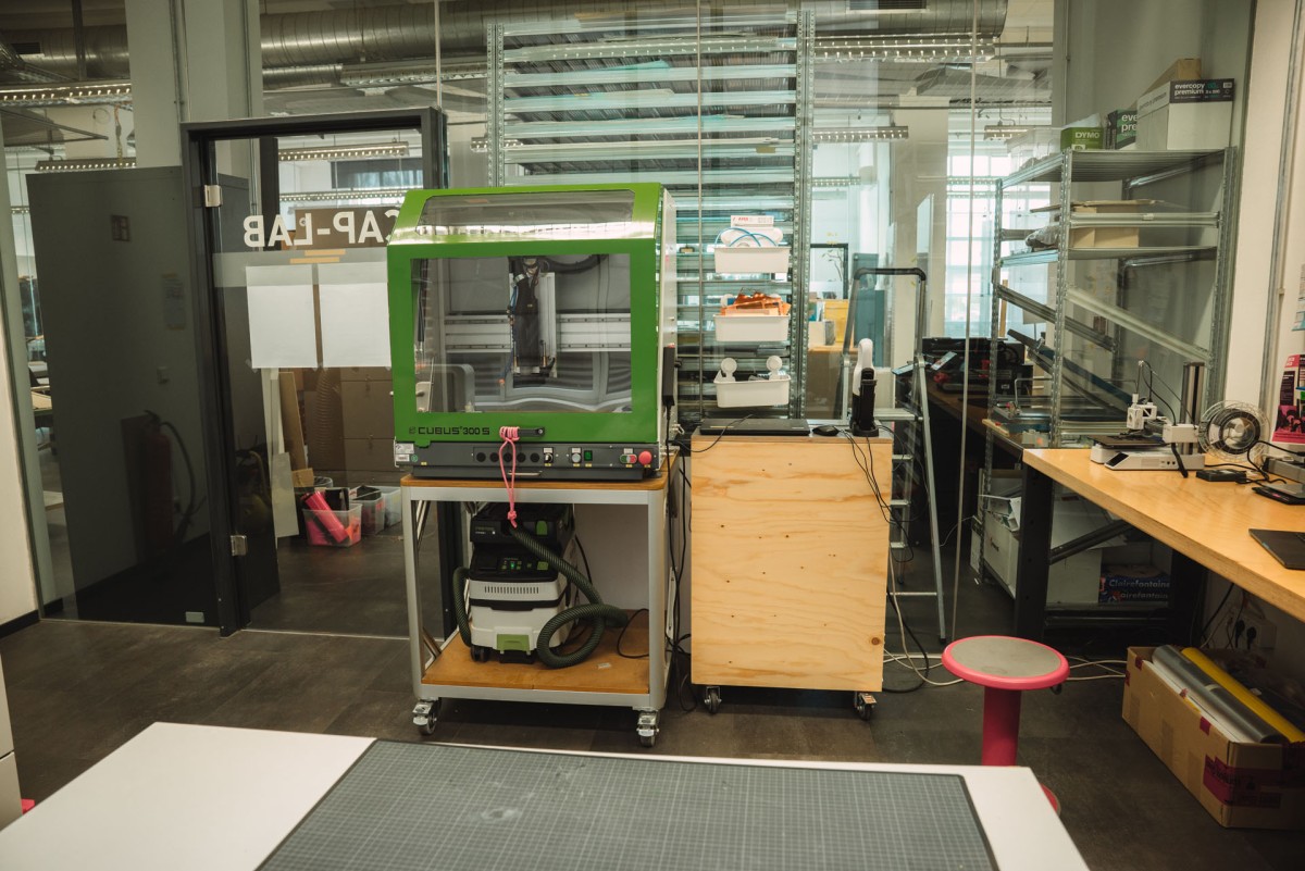 Im CAP Lab werden digitale Entwurfsdaten in physische Modelle und Bauteile übersetzt. Der Raum ist auf computergestützte Fertigung ausgerichtet und ermöglicht präzise, wiederholbare und experimentelle Herstellungsprozesse. Zur Ausstattung gehören zwei Prusa 3D-Drucker (MK3 und MK3S), die u.a. mit PLA und PETG genutzt werden können, ein Lasercutter für zweidimensionale Schnitte in Materialien wie Acrylglas, MDF oder Pappe, eine kleine CNC-Fräse zur Herstellung eigener Platinen sowie ein Plotter zum Schneiden von Klebefolien und grafischen Elementen. Das CAP Lab verbindet digitale Planung mit praktischer Umsetzung und erweitert die Werkstatt um Verfahren, die besonders dort relevant sind, wo Präzision, Reproduzierbarkeit und die enge Verbindung von Gestaltung und Technik gefragt sind.