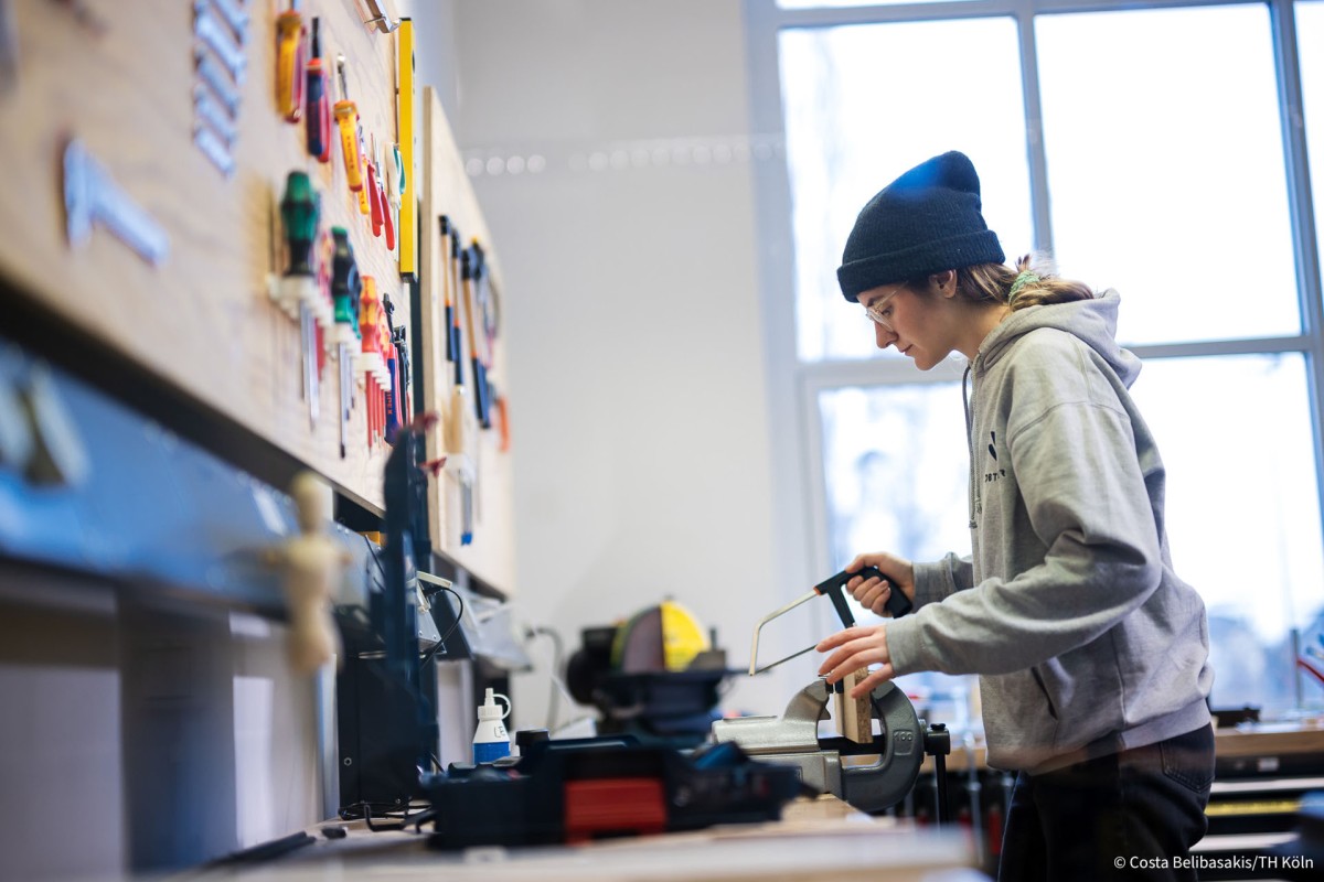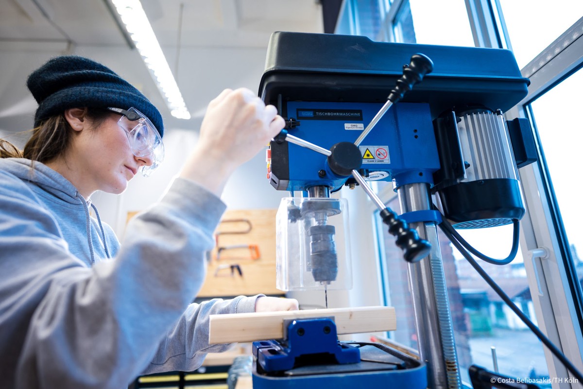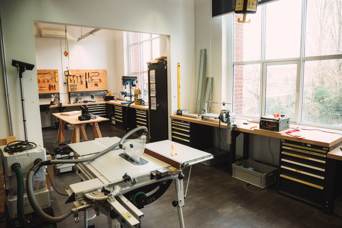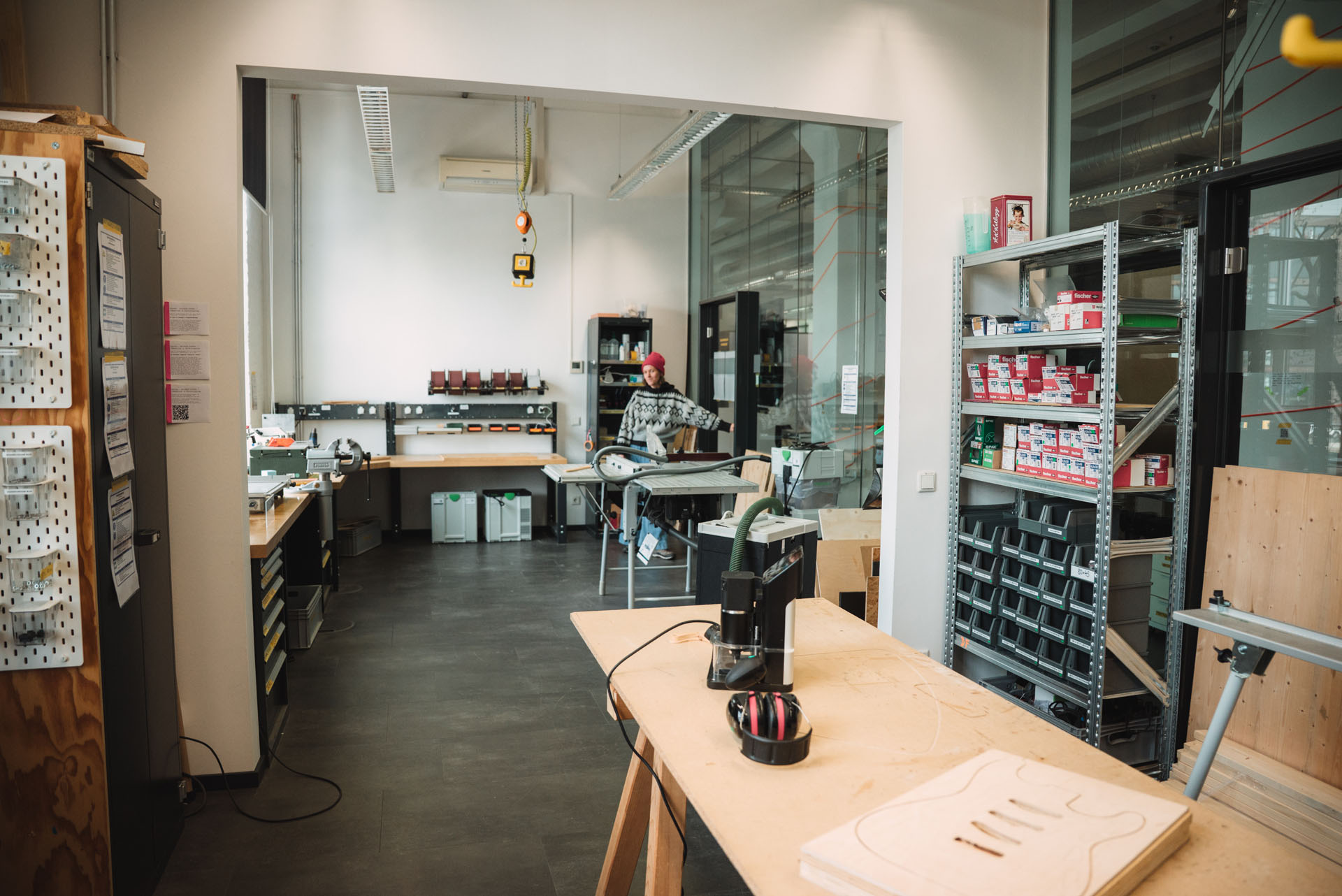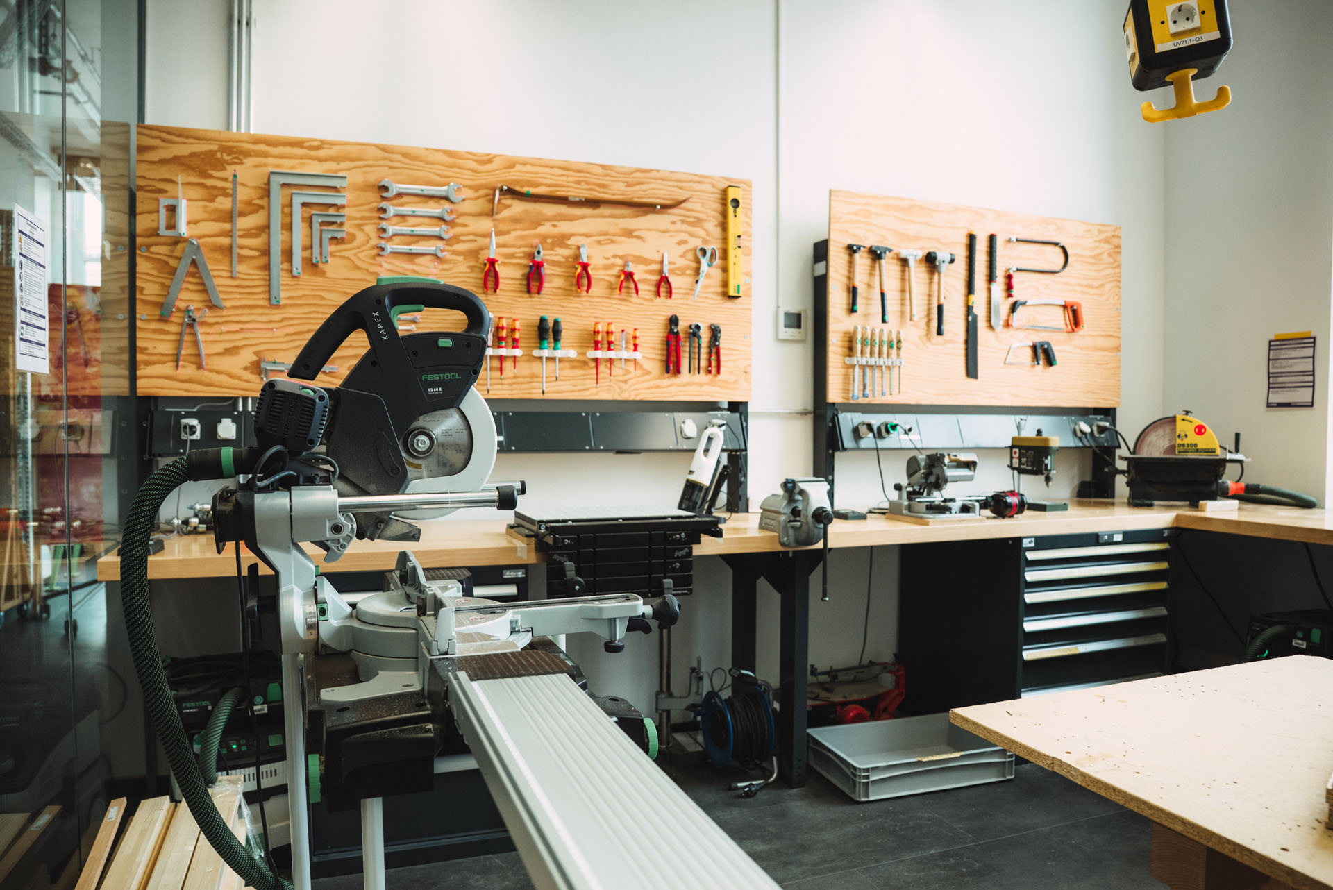 Die Werkstatt ist der Raum für analoge Fertigung, Konstruktion und unmittelbare Materialerfahrung. Hier wird mit Holz, Kunststoff und Metall gearbeitet, gesägt, gebohrt, geschliffen, gefügt und angepasst. Zur Ausstattung gehören unter anderem Kappsäge, Modellbau-Tischkreissäge, Bandsäge, Bohrmaschinen, Tellerschleifer sowie verschiedene Handwerkzeuge. Ergänzt wird der Bereich durch mobile Geräte wie Akkuschrauber, Stichsäge und Handkreissäge sowie Werkzeuge wie der Shaper als handgeführte CNC-Fräse und der Winkelschleifer. Die Werkstatt ermöglicht ein praktisches Verständnis für Material, Verbindung, Stabilität und Maßlichkeit. Sie ist damit nicht nur Produktionsort, sondern auch ein zentraler Lernraum, in dem Entwurf durch das Arbeiten mit den Händen überprüfbar wird.
